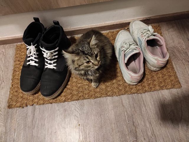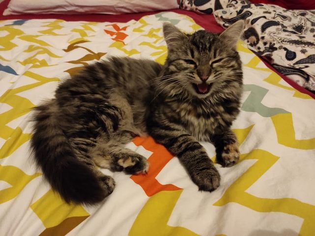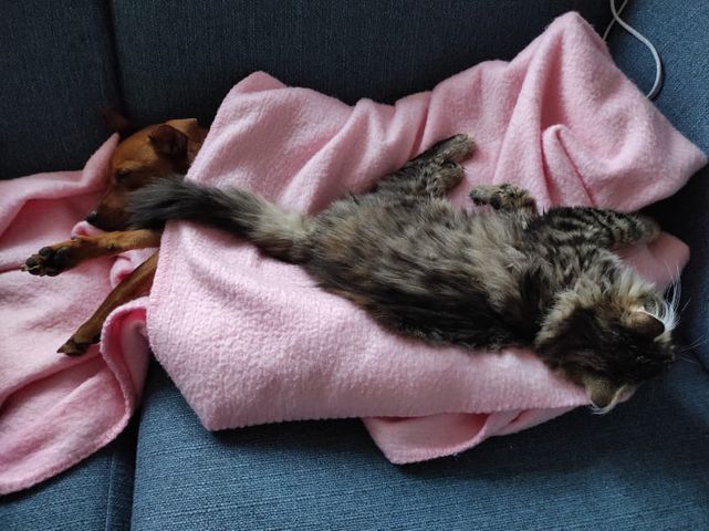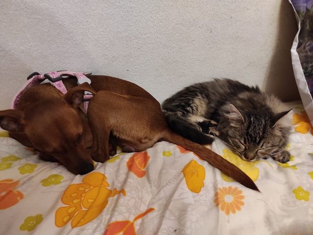 „Prvních pár dnů se koťátko rozkoukávalo po svém novém domově. Hned po otevření dvířek od přepravky mělo radost ze svého vlastního škrabadla a hned si zkusila nabrousit drápky. Začala opatrně prozkoumávat náš byt. Na svůj záchůdek si zvykla rychle. To ovšem tolik neplatilo v případě našeho psíka Jasmíny. Nevěděla, co od ní čekat, syčela a ježila se na ni. Jasmína do toho chudák ještě hárala a místo nějakého pěkného psího frajera od nás dostala takový chlupatý dáreček.