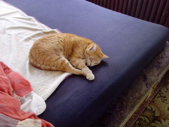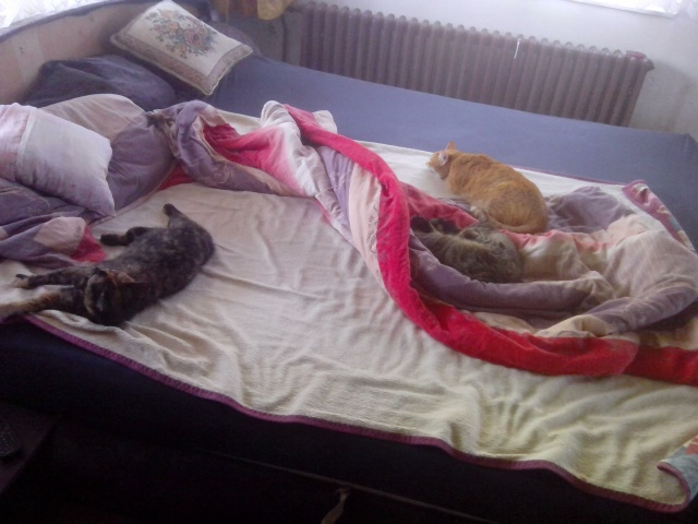 Bartoloměj se má dobře. Má u sebe dvě dlouholeté kamarádky Pucika a Vendulku. Mají vše co si může kočka přát. Na výběr z granulek nebo konzerv, volný přístup do bytu, takže nejsou omezováni žádným čekáním, kdo je pustí domů. Jak vidíte na fotkách, postel je jejich revírem. ❤️🐈