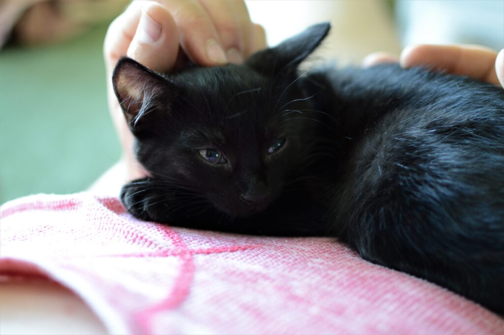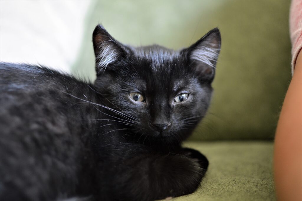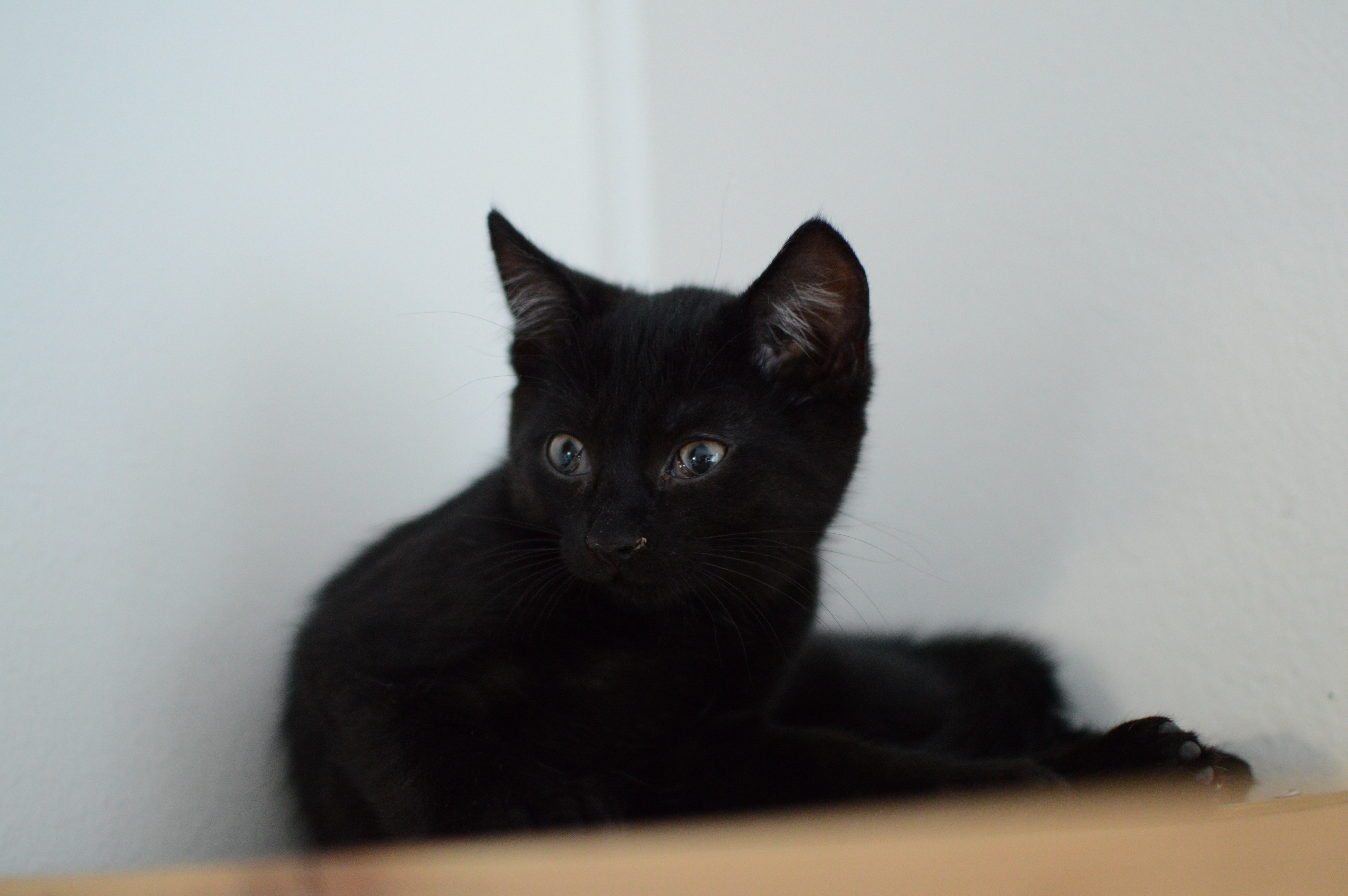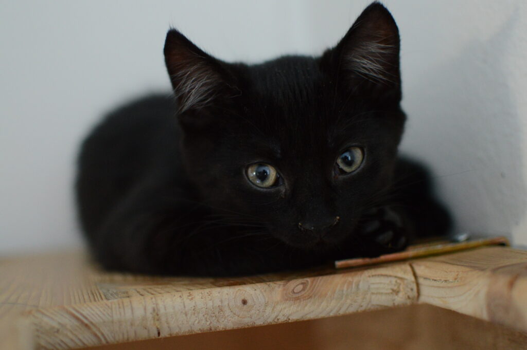 Jsem černá kočička, která má pár bílých chloupků. Jako malé koťátko jsem byla hodně bázlivá, vždy jsem se raději držela stranou a přihlížela dění. Teta mě ale neustále mazlila, tak jsem nabrala více sebedůvěry. Pořád ale nejsem takový suverén jako moji bráchové.