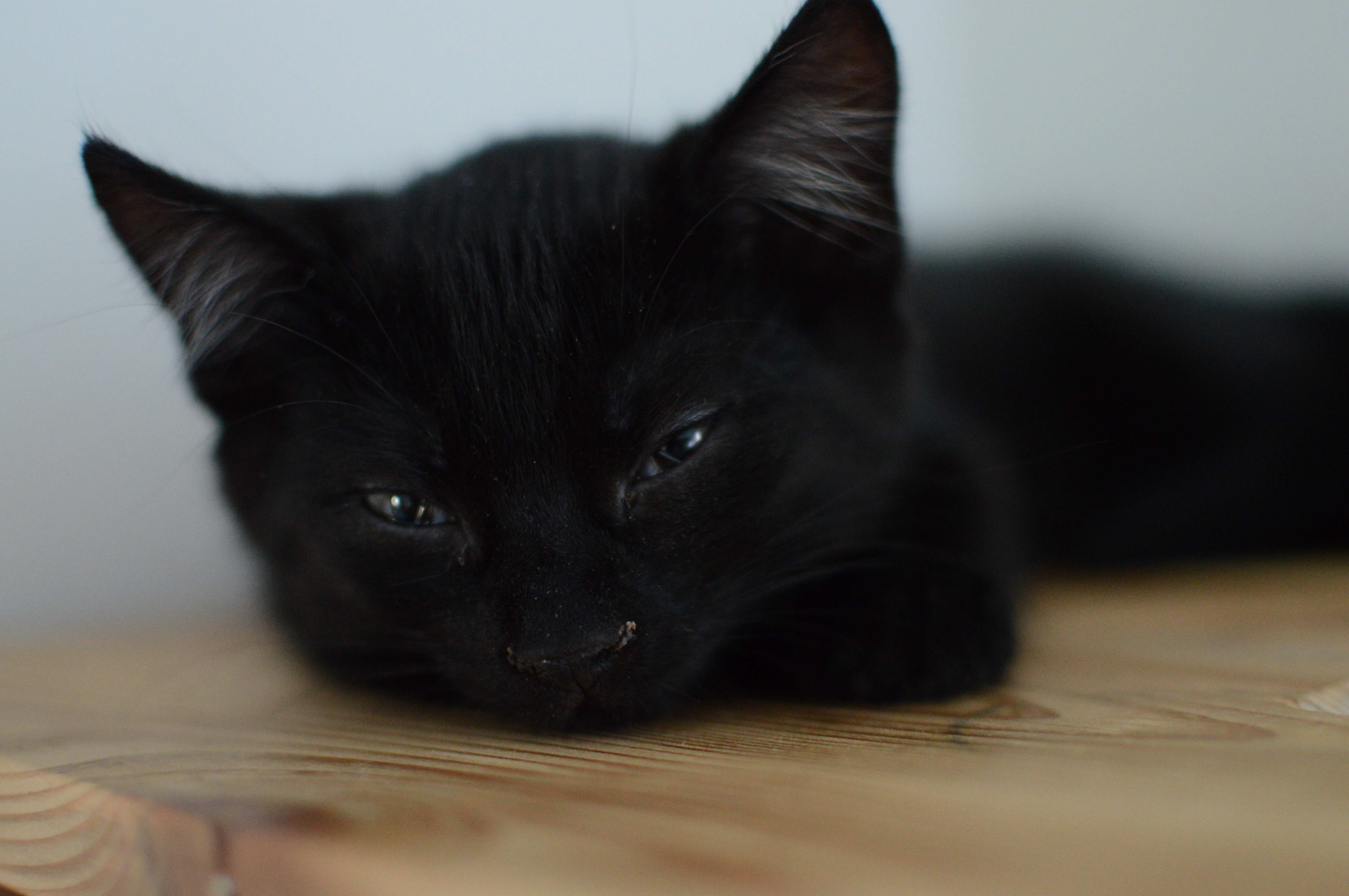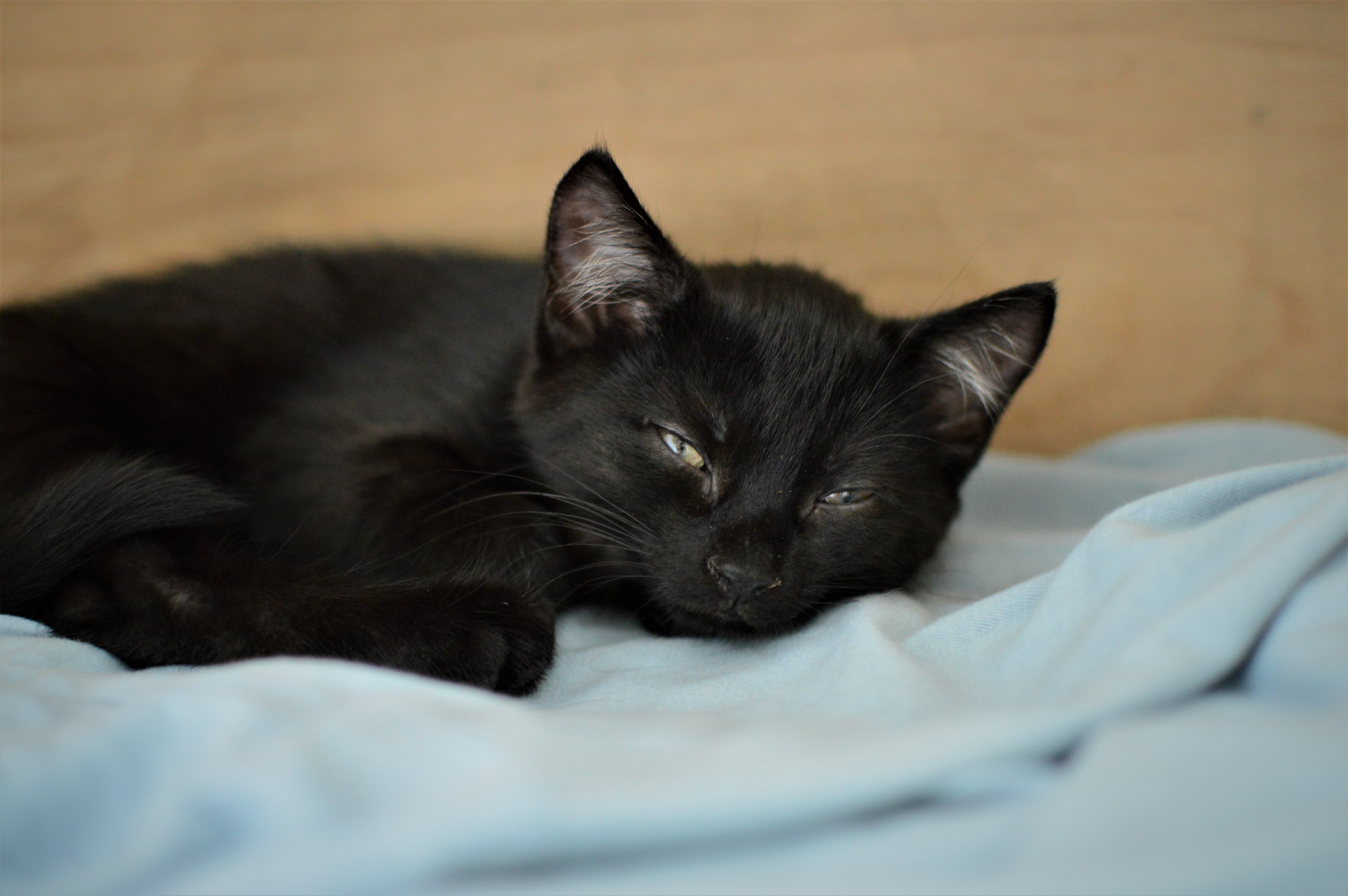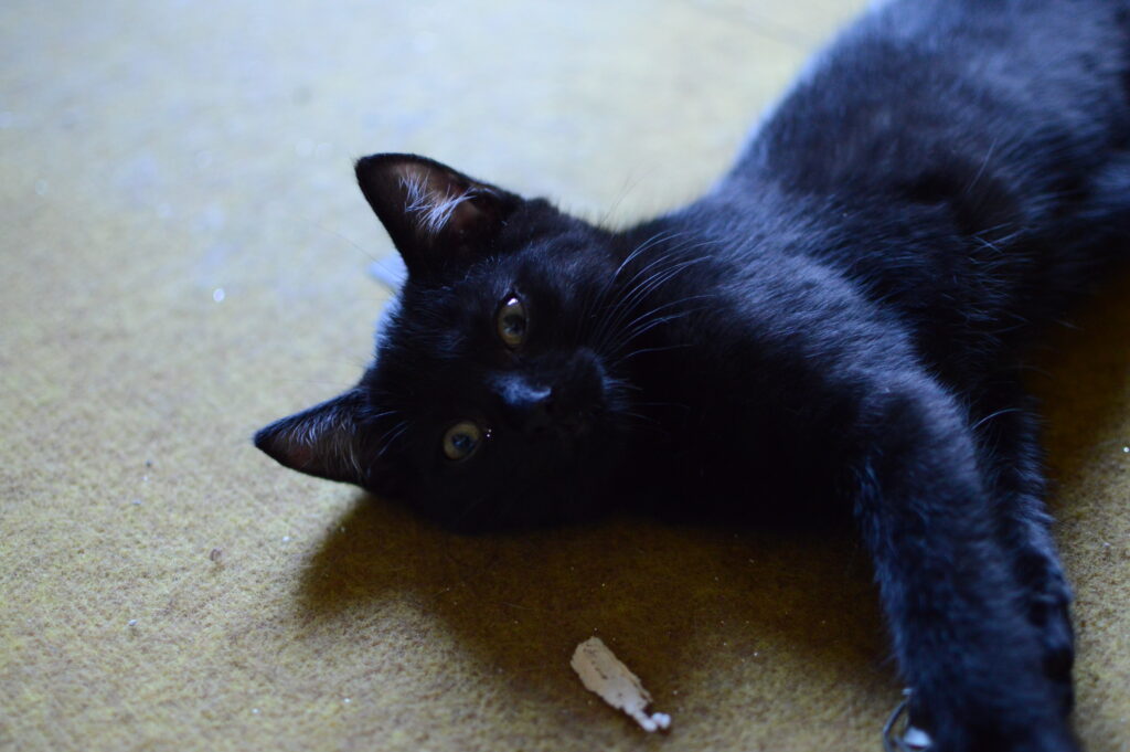 Jsem černá kočička, která má pár bílých chloupků. Jako malé koťátko jsem byla hodně bázlivá, vždy jsem se raději držela stranou a přihlížela dění. Teta mě ale neustále mazlila, tak jsem nabrala více sebedůvěry. Pořád ale nejsem takový suverén jako moji bráchové.