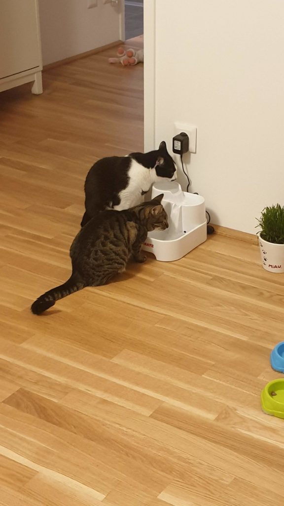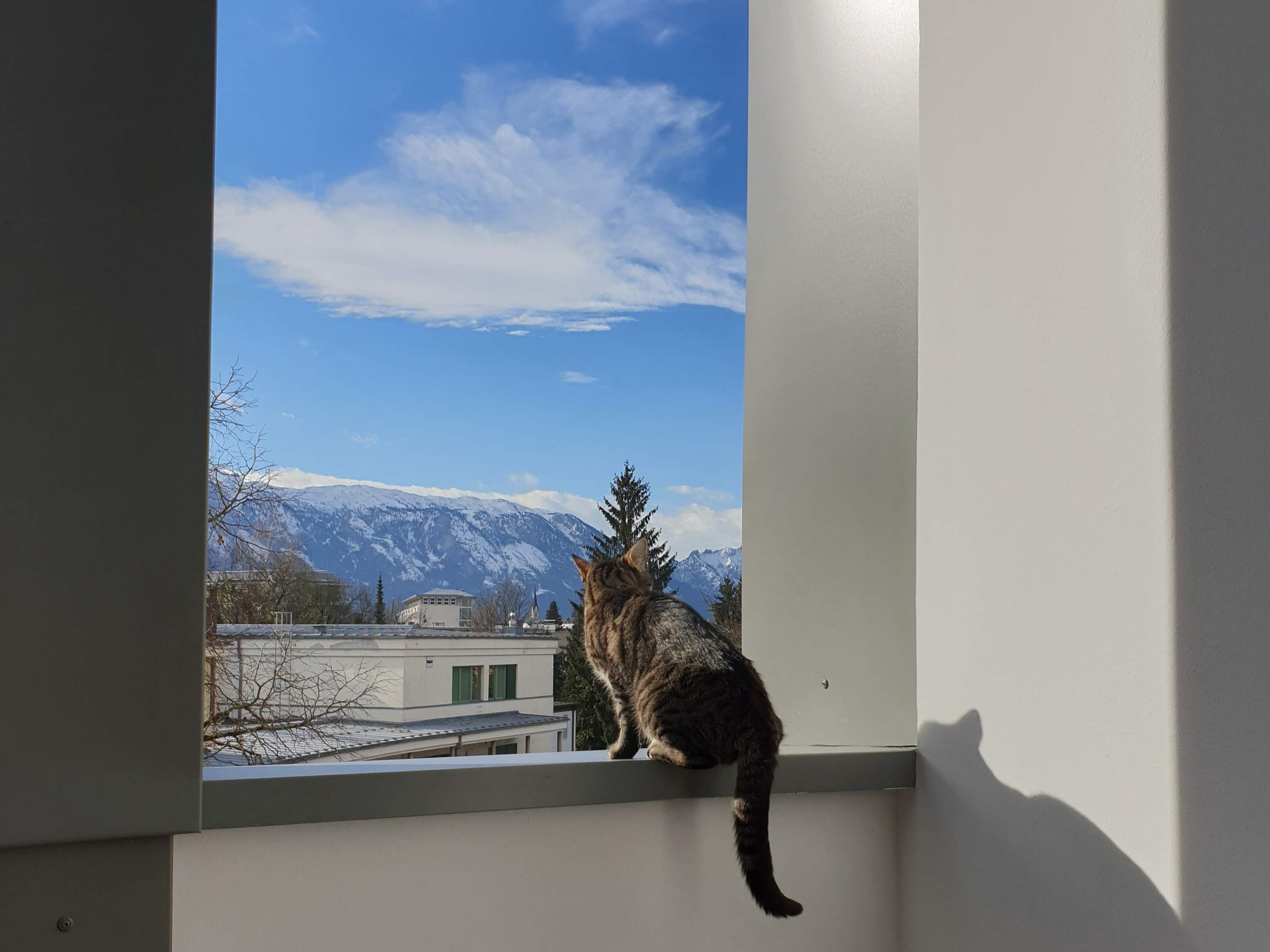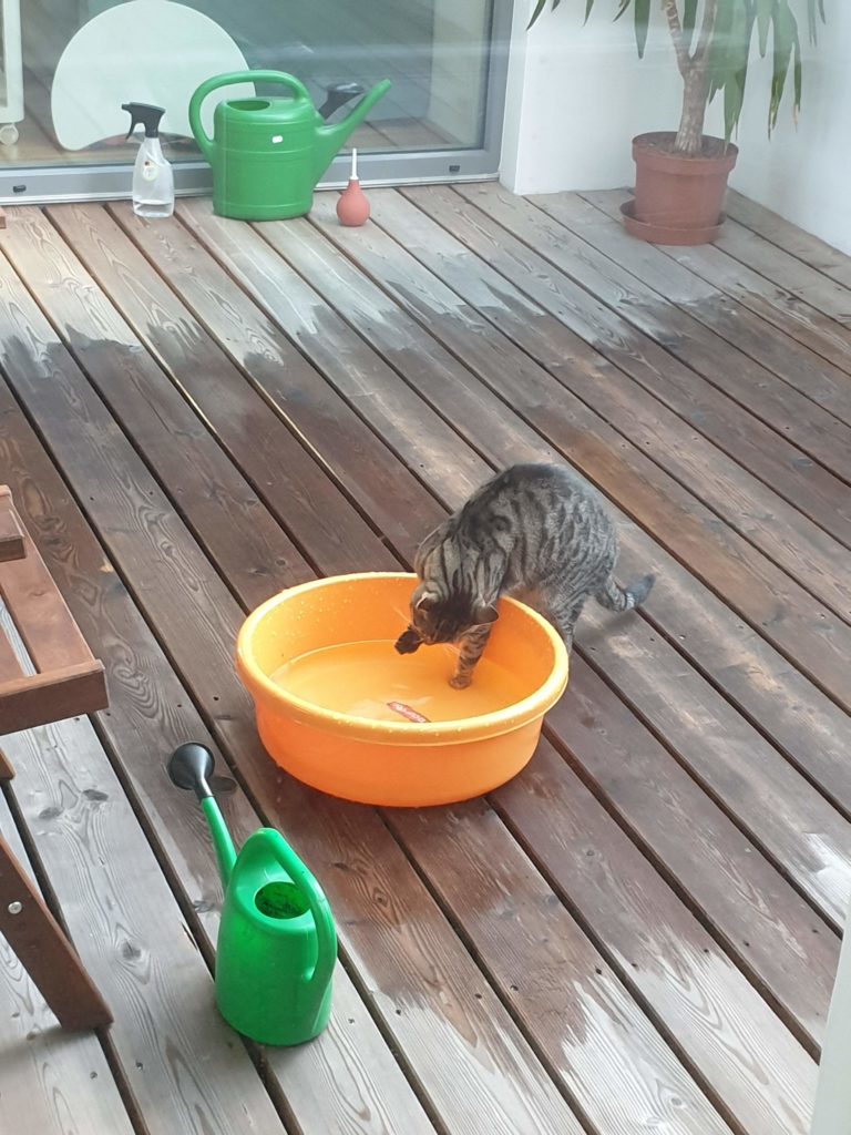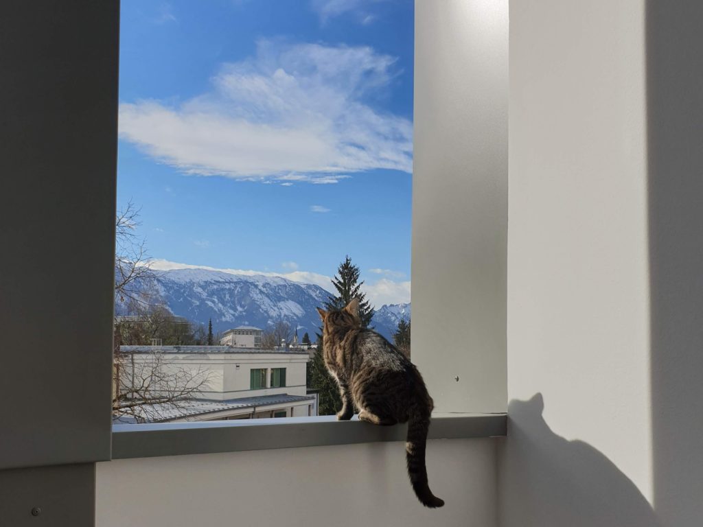 Pak si maminka vymyslela, že se všichni čtyři přestěhujeme do Rakouska. Museli jsme přežít jednu hroznou pětihodinovou cestu Praha-Salzburg, ale od té doby máme na běhání (a hlavně na spaní) mnohem větší byteček, který je navíc ve třetím patře, takže z parapetů můžeme pozorovat veškeré dění široko daleko. Taky má ten byteček terasu, kde s Bonnie spinkáváme, sluníme se, honíme mouchy, koukáme na Alpy, koupeme se v kalužích a to nejdůležitější – nadáváme všudypřítomným holubům. Ti tu jsou neuvěřitelně drzí a klidně si sednou na střechu nebo na okap a vrkají. Já se z toho pak můžu zbláznit a nadávám jim, co se do nich vejde a Bonnie mi zdatně sekunduje. Dalším mým oblíbeným koníčkem je máčení si tlapek ve vodě. Když na terasu naprší, tak se vesele promenáduji v kalužích. A když je zrovna sucho, tak si máčím tlapky alespoň v kočičí fontánce na vodu. 😹