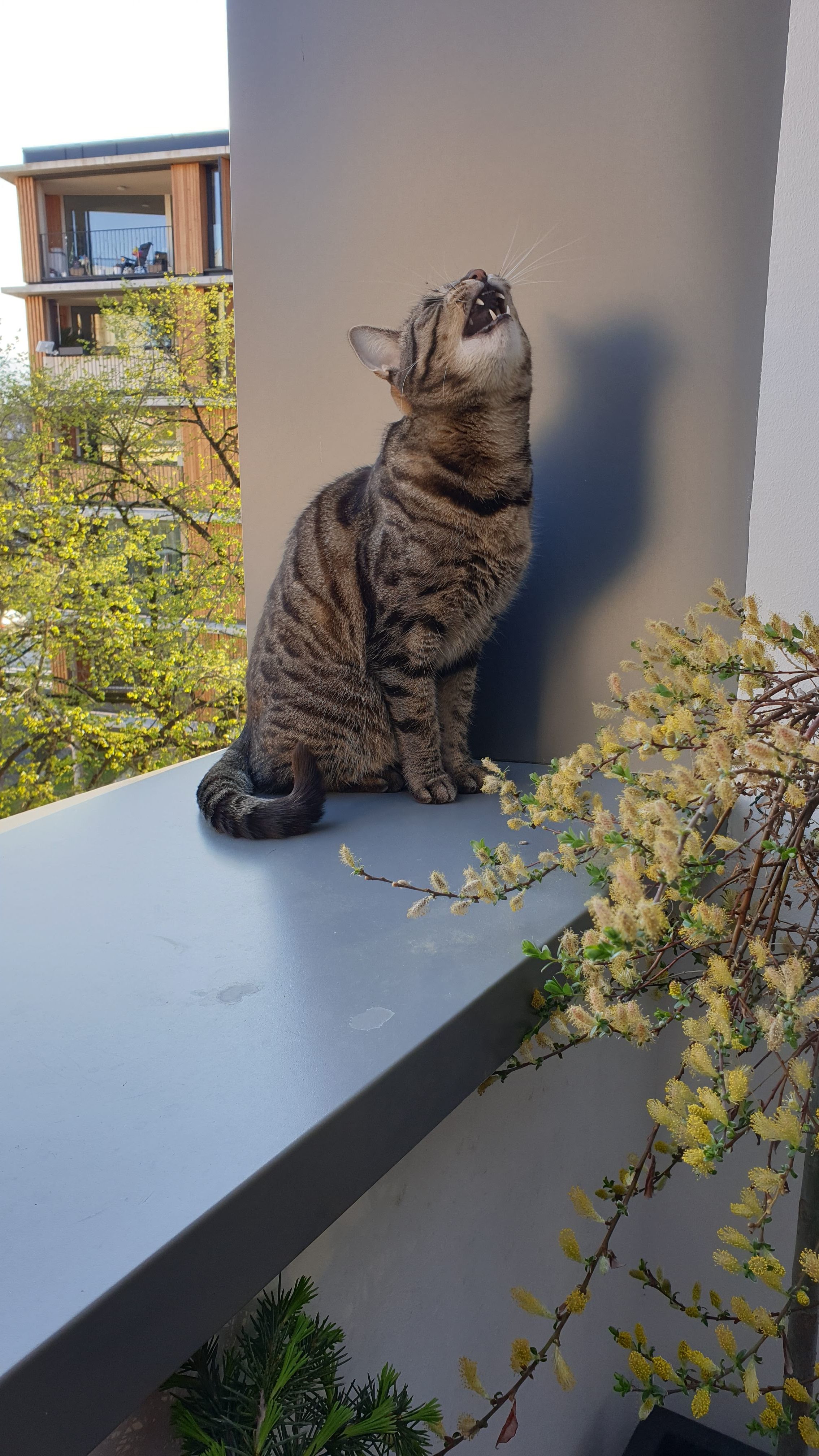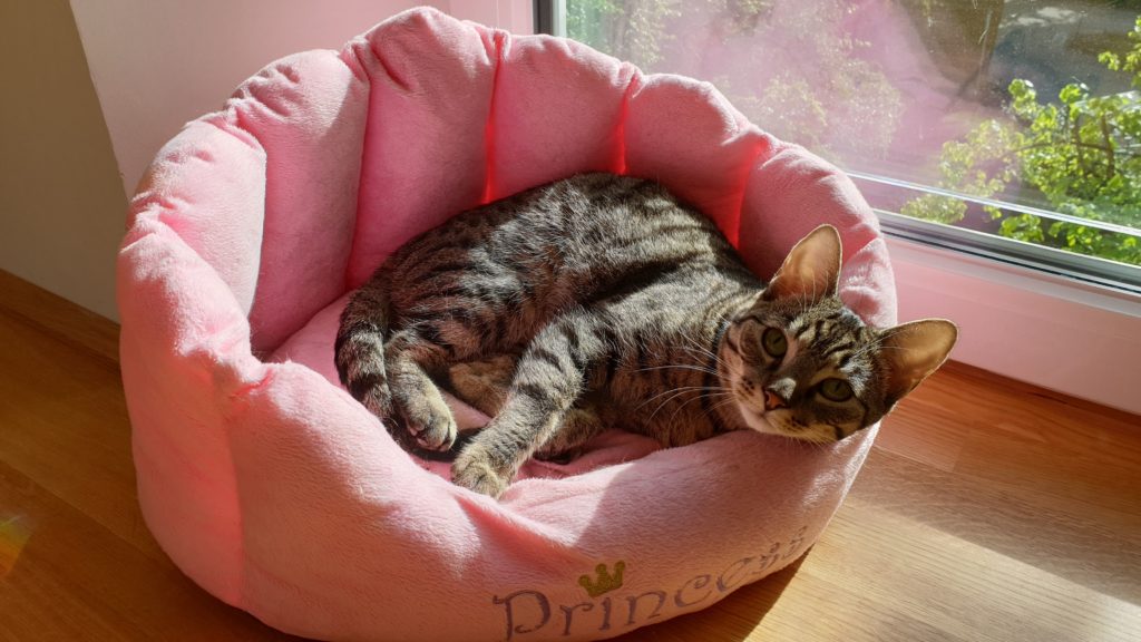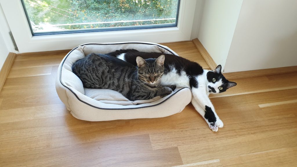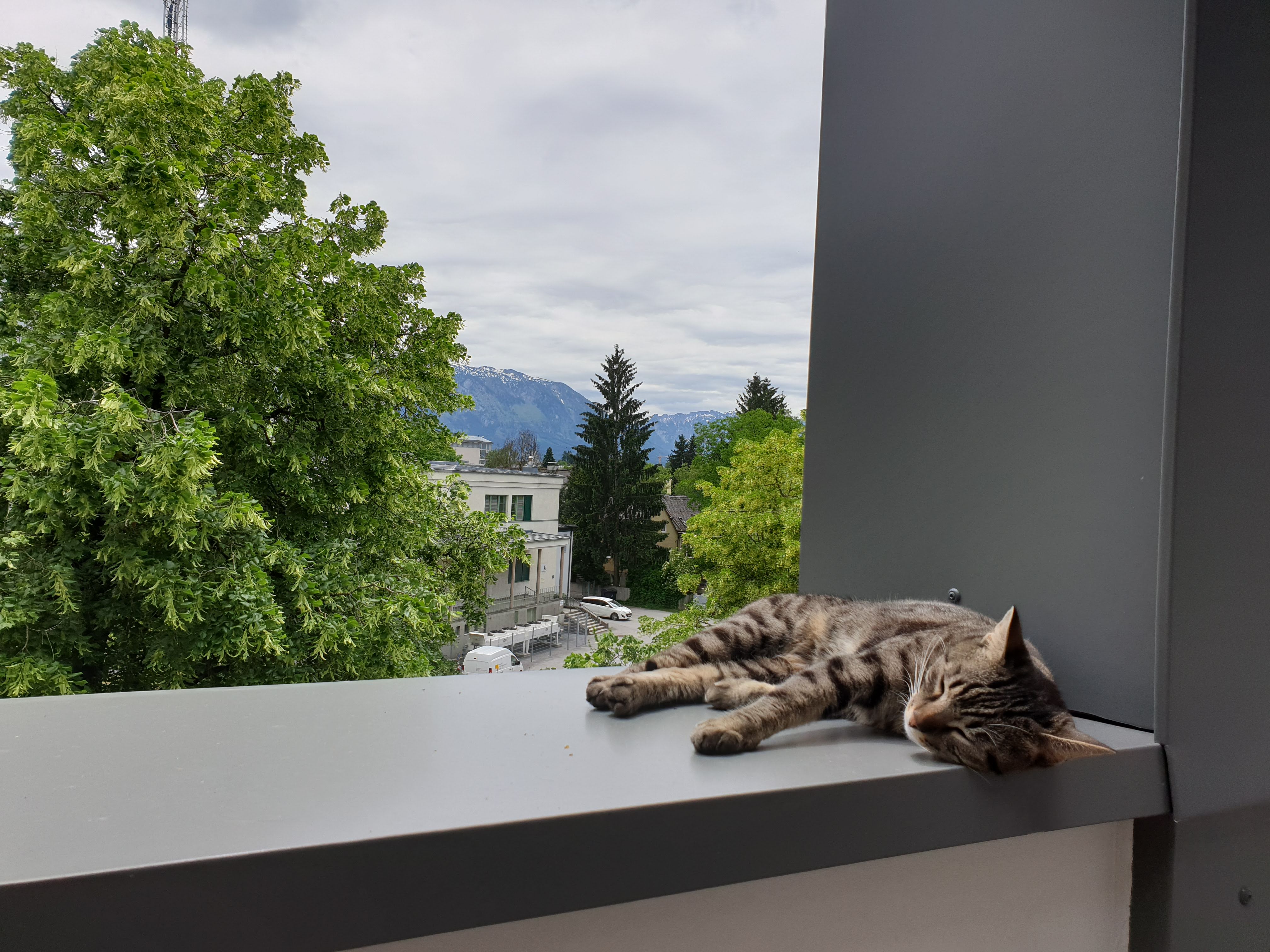 Pak si maminka vymyslela, že se všichni čtyři přestěhujeme do Rakouska. Museli jsme přežít jednu hroznou pětihodinovou cestu Praha-Salzburg, ale od té doby máme na běhání (a hlavně na spaní) mnohem větší byteček, který je navíc ve třetím patře, takže z parapetů můžeme pozorovat veškeré dění široko daleko. Taky má ten byteček terasu, kde s Bonnie spinkáváme, sluníme se, honíme mouchy, koukáme na Alpy, koupeme se v kalužích a to nejdůležitější – nadáváme všudypřítomným holubům. Ti tu jsou neuvěřitelně drzí a klidně si sednou na střechu nebo na okap a vrkají. Já se z toho pak můžu zbláznit a nadávám jim, co se do nich vejde a Bonnie mi zdatně sekunduje. Dalším mým oblíbeným koníčkem je máčení si tlapek ve vodě. Když na terasu naprší, tak se vesele promenáduji v kalužích. A když je zrovna sucho, tak si máčím tlapky alespoň v kočičí fontánce na vodu. 😹