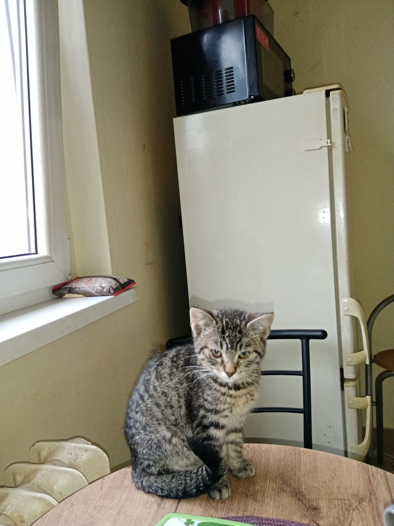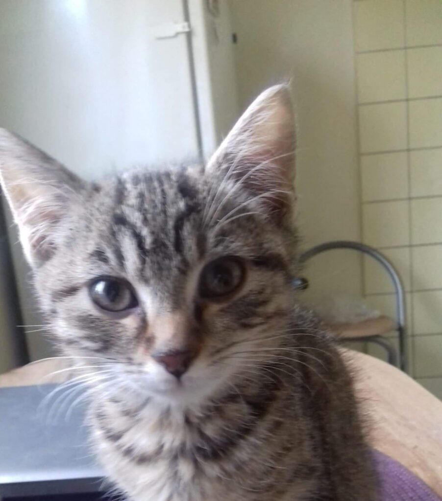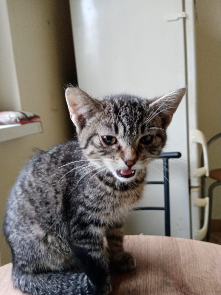 Cesta z péče byla pro mě náročná, protože jsem byl už sám a moc jsem se bál. Když jsme dojeli do toho mého nového domova, nemohl jsem uvěřit jak je veliký. Takže ten večer jsem byl jenom schopný okukovat obyvák. Na druhý den jsem sebral odvahu a začal jsem objevovat celý dům. No a teď mám vše perfektně prozkoumané, tak se můžu věnovat kotěcím záležitostem jako je hraní a běhání. Moje nejoblíbenější hračka je gumička do vlasu 🙂. Už jsem se naučil i objevovat kuchyňskou linku z vrchu.