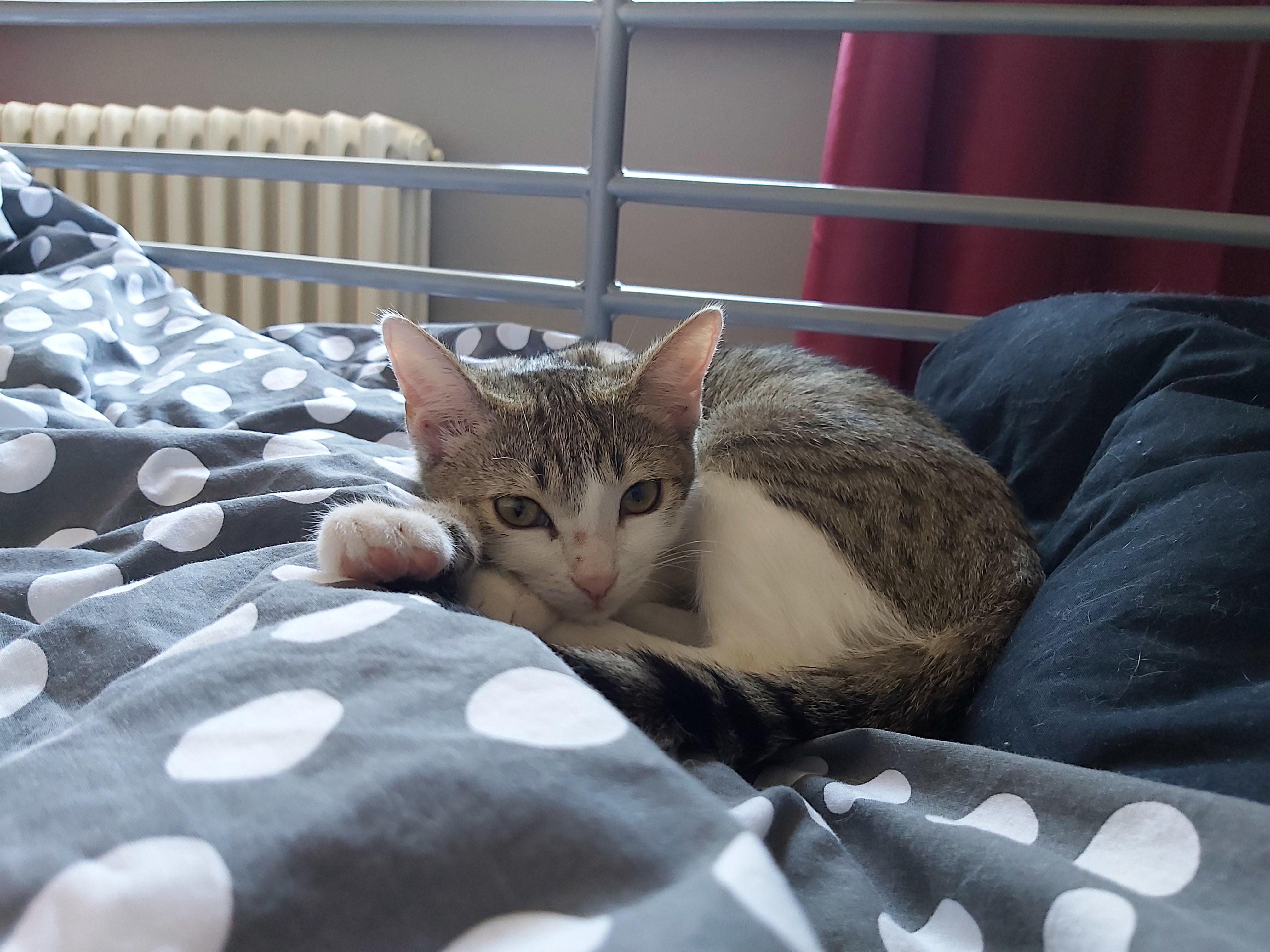 V pelechu spí jen když ví, že něco provedla, ale to my už prokoukli a většinou je to večer, když ví, že dělá velký bordel. Ale po chvíli se stejně uvelebí v posteli za hlavou a spinká až do rána.