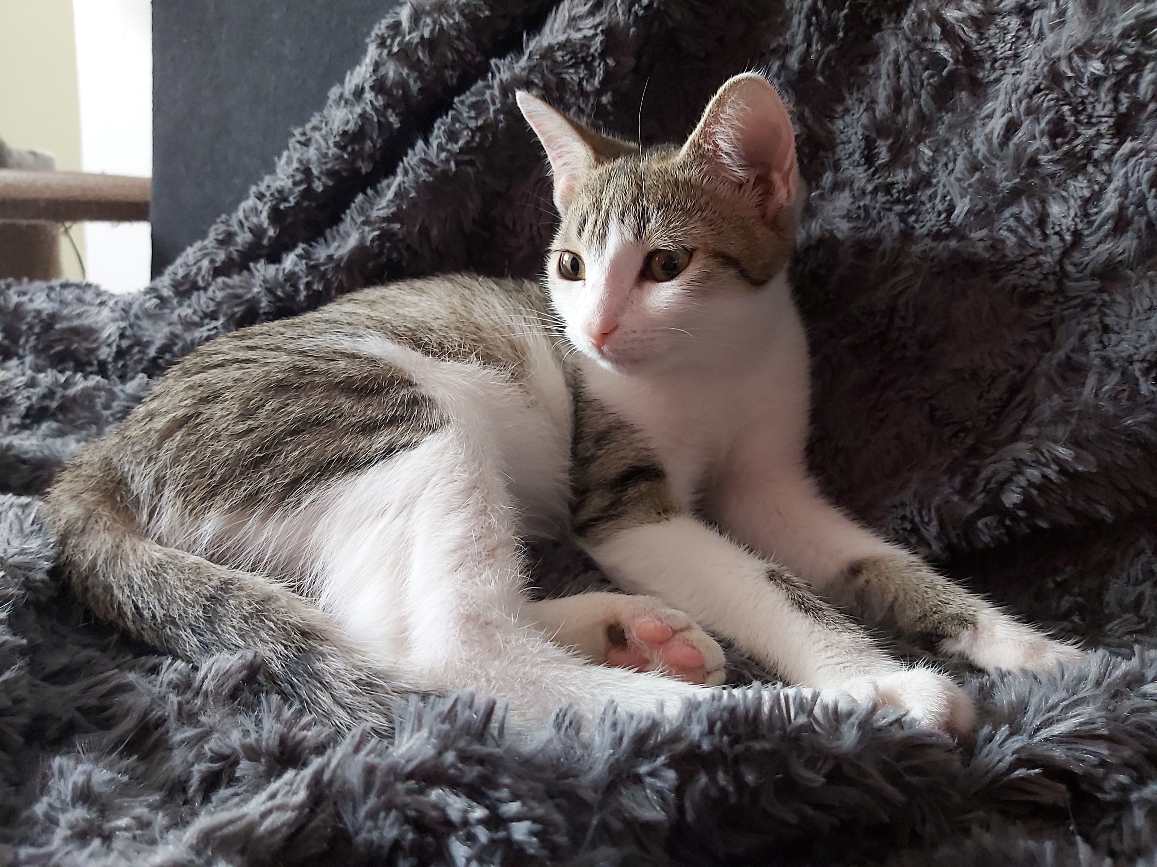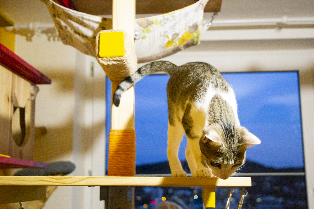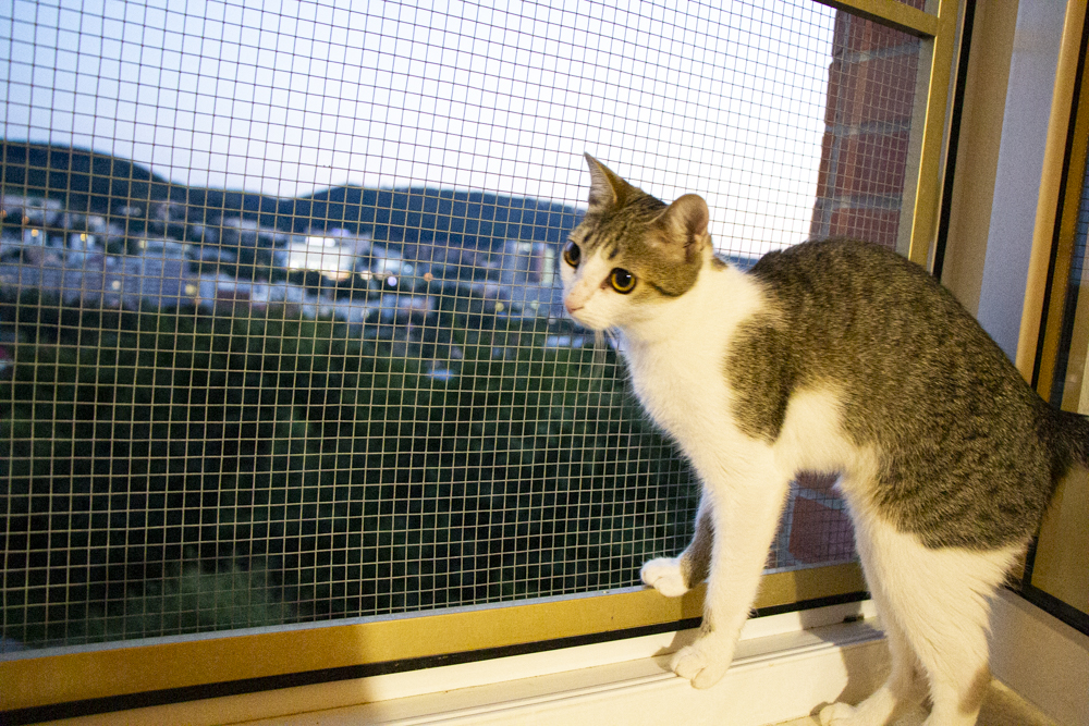 Denny je ještě trošku bázlivý, raději leží na parapetu a sleduje ptáčky za oknem nebo se honíme po celém bytě za světýlkem. To máme oba moc rádi. A kde spíme? Já samozřejmě v posteli a Denny si zabral křeslo.