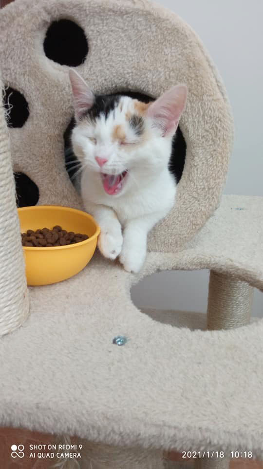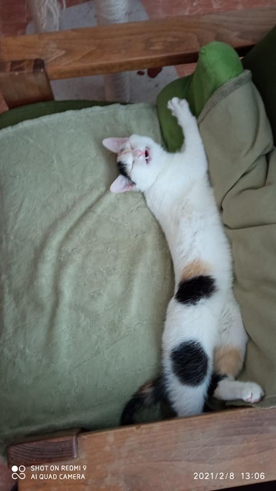 Myslíme, že je u nás velice spokojená. Polehává nejvíce v dětském domečku a občas využije i kočičí věž. Do svého chráněného pelíšku kde byla první týden už vůbec nechodí. Sleduje dění v nejrušnější místnosti, kouká s dcerou na pohádky, dovádí se synem a doprovází manžela na každém kroku. Teď, když už začalo svítit sluníčko, tak si moc ráda nahřívá kožíšek přímo za sklem.